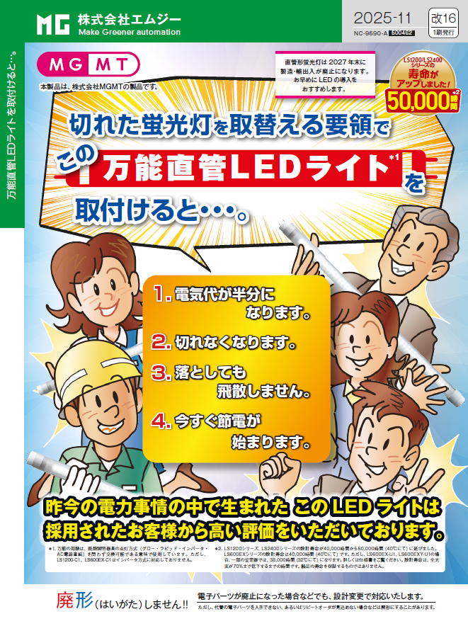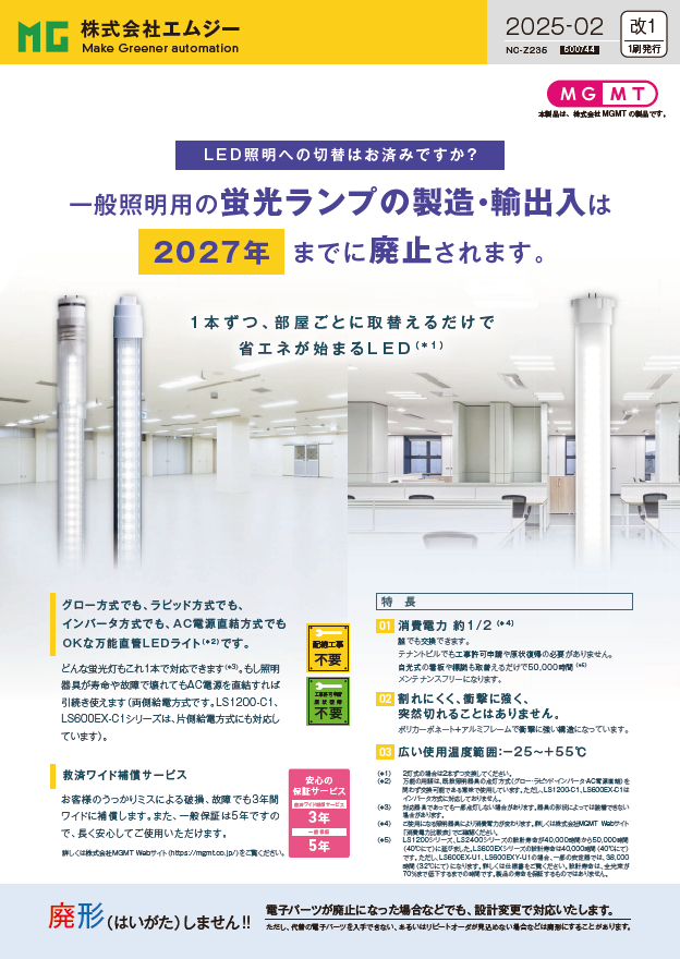 2027年までに一般照明用の蛍光ランプの製造・輸出入は禁止されます。是非、この機会にLEDライトシリーズに交換をおすすめします。